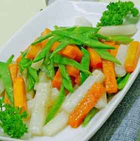 配料:原料:荷兰豆、山药、南瓜制作方法:(1) 荷兰豆洗干净,去二头,去二边筋丝,然后切斜长条待用。(2) 山药刨皮后切成长条待用。(3) 南瓜刨皮后切成长条待">